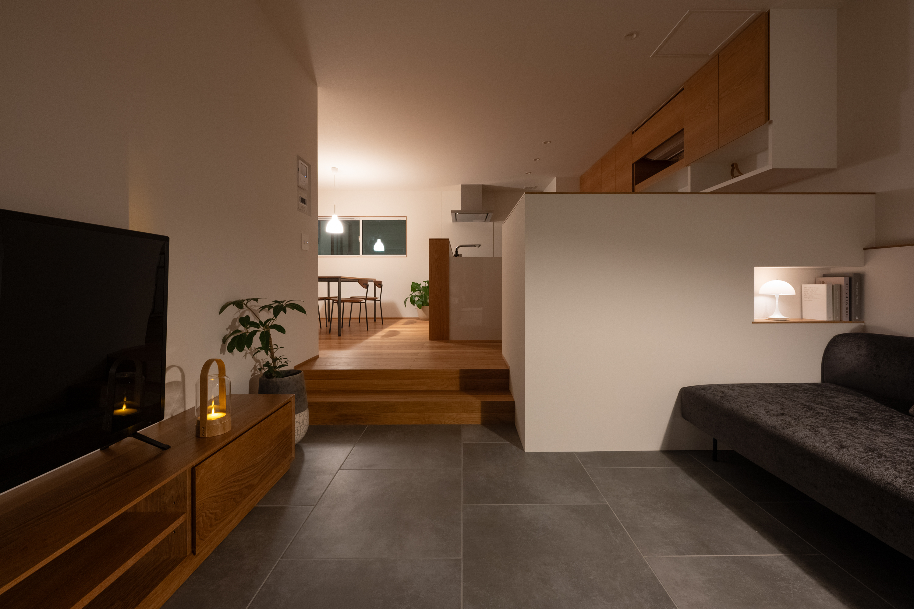 キッチンやダイニングはやさしい天然木の空間、リビングはタイルの空間と仕切ることで広々と感じるでしょう。スキップフロアに座ることもできます。