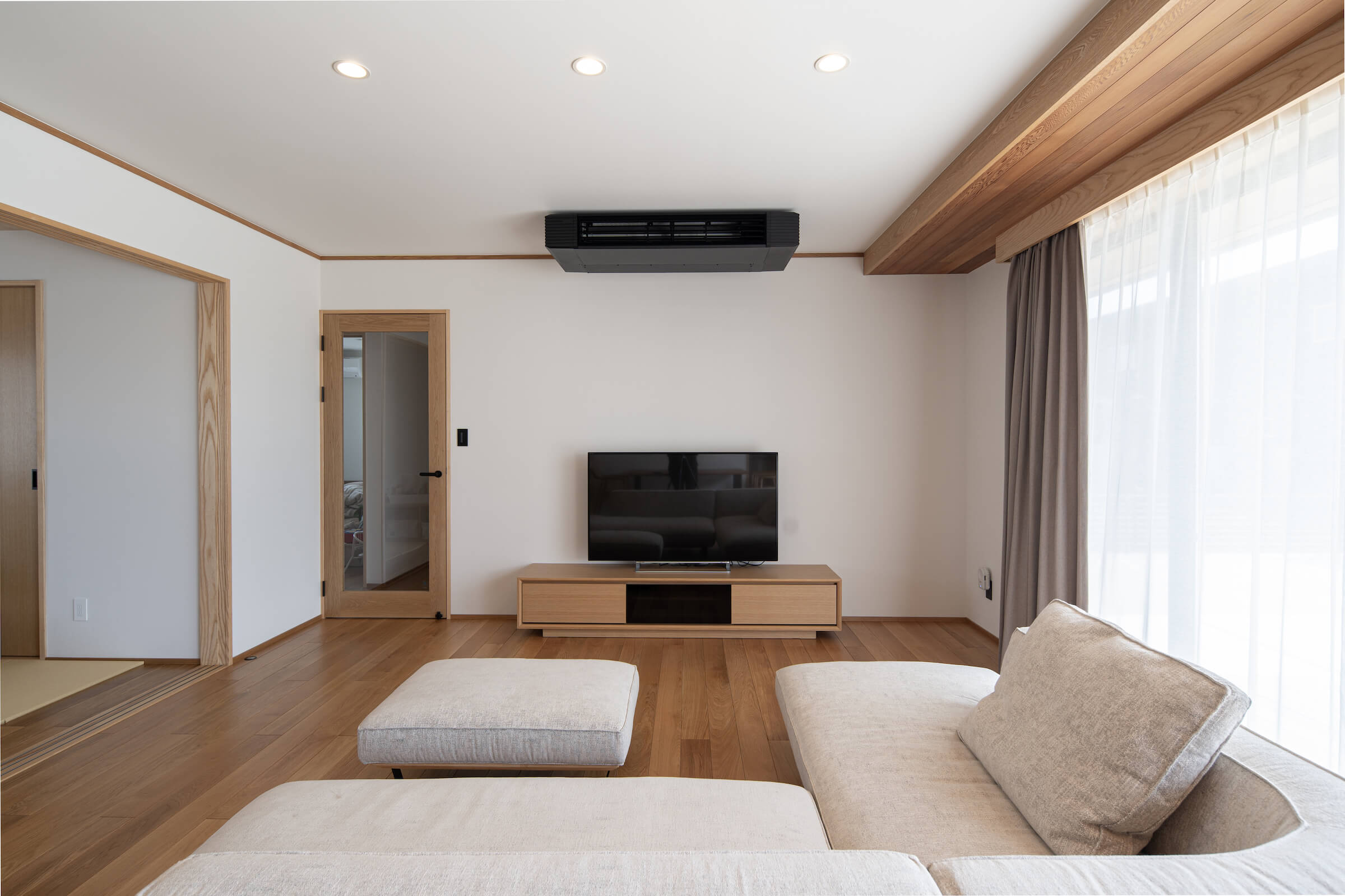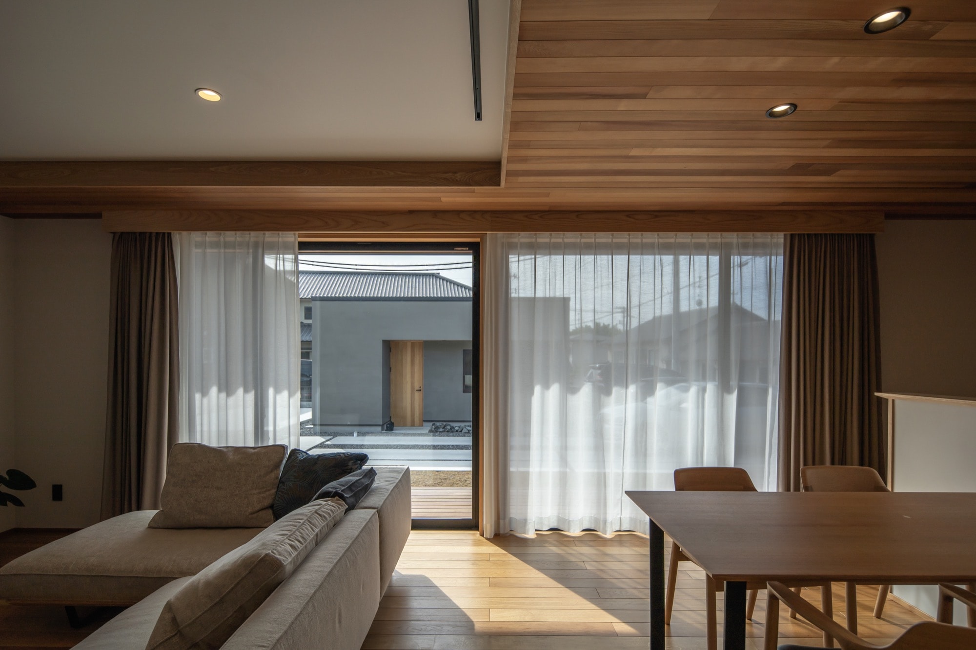 こちらは岡山市のK様邸です。母屋の中心となる22.5帖のLDKに、折り下げ天井を配しています。広々したLDKに奥行きと立体感が生まれ、ゆったりくつろげる空間に仕上がりました。