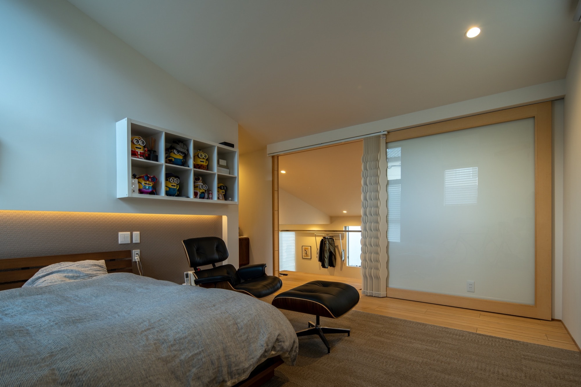 また寝室は、広いリビングからアクセスしやすい中2階に設けています。