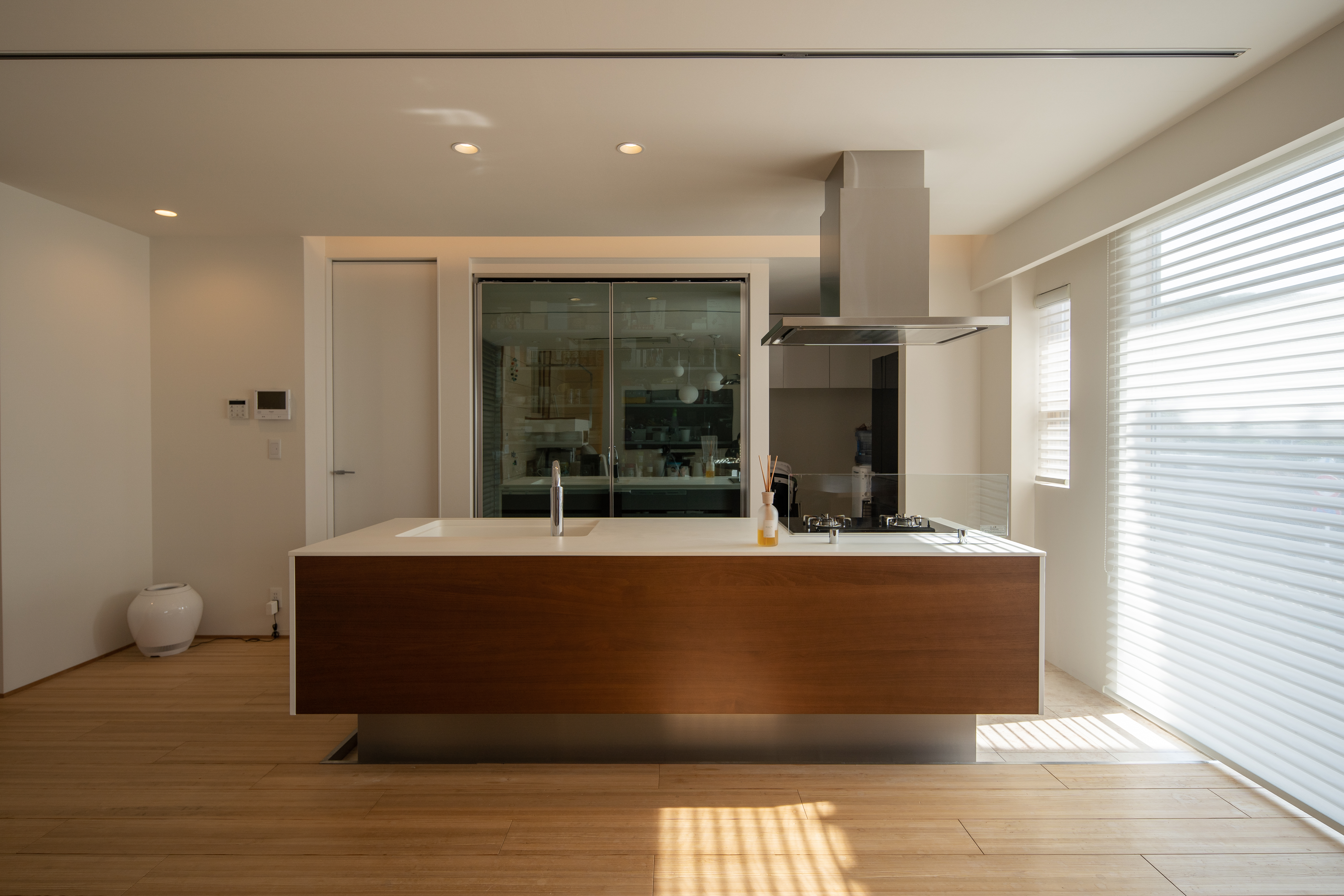 リビングに連なるキッチンのデザインには、壁面から離れた独立した場所に設置するアイランドキッチンを採用しました。広いリビングとの一体感が増し、見晴らしの良い空間に仕上がっています。