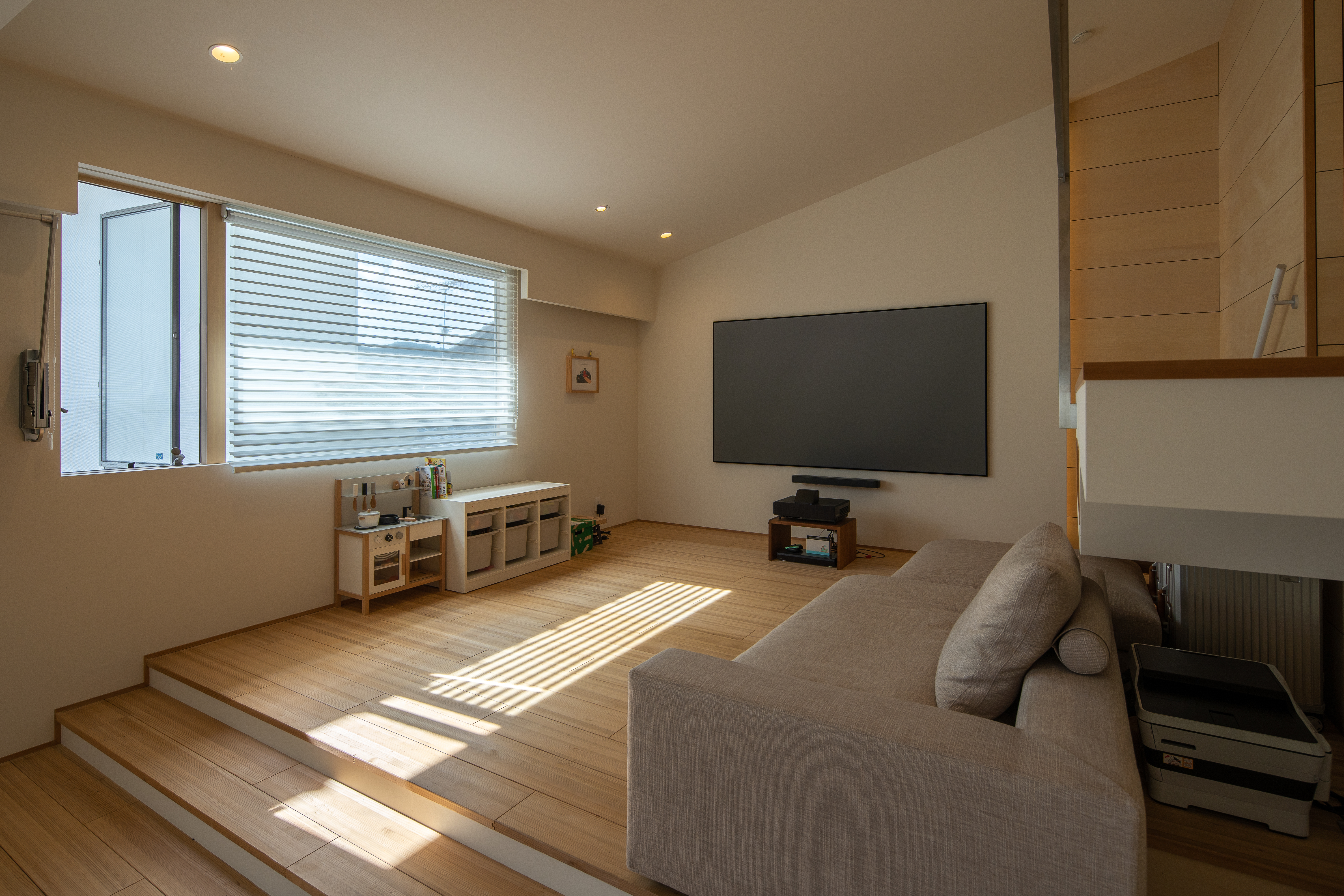 H様邸の場合は、テレビを見ながらくつろげるスペースを数段高くして、高さを出しています。開放感を維持しながら、メリハリのあるレイアウトが実現しました。