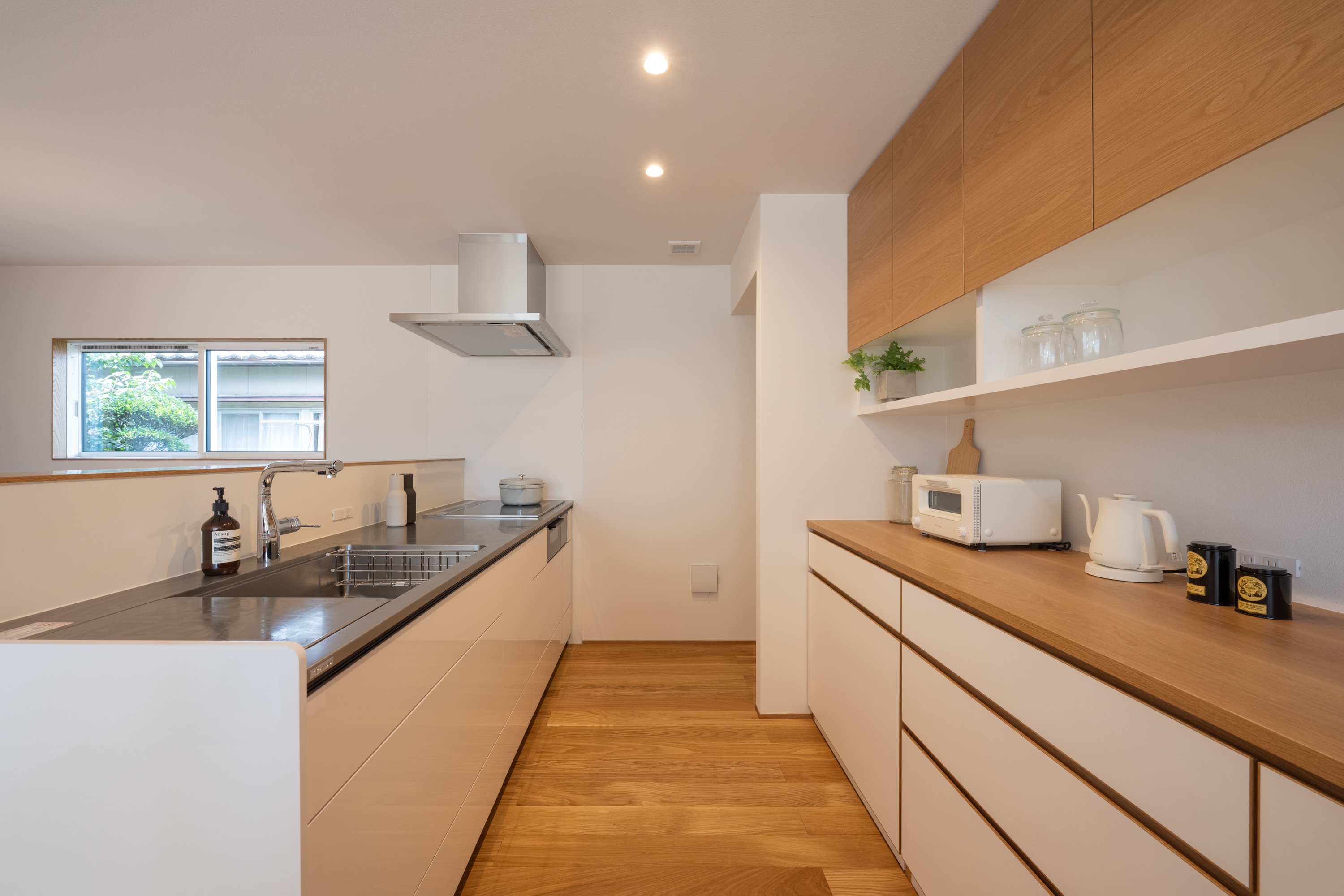 キッチンの床材と収納の色合いの統一感により、すっきりとした印象が際立ちます。