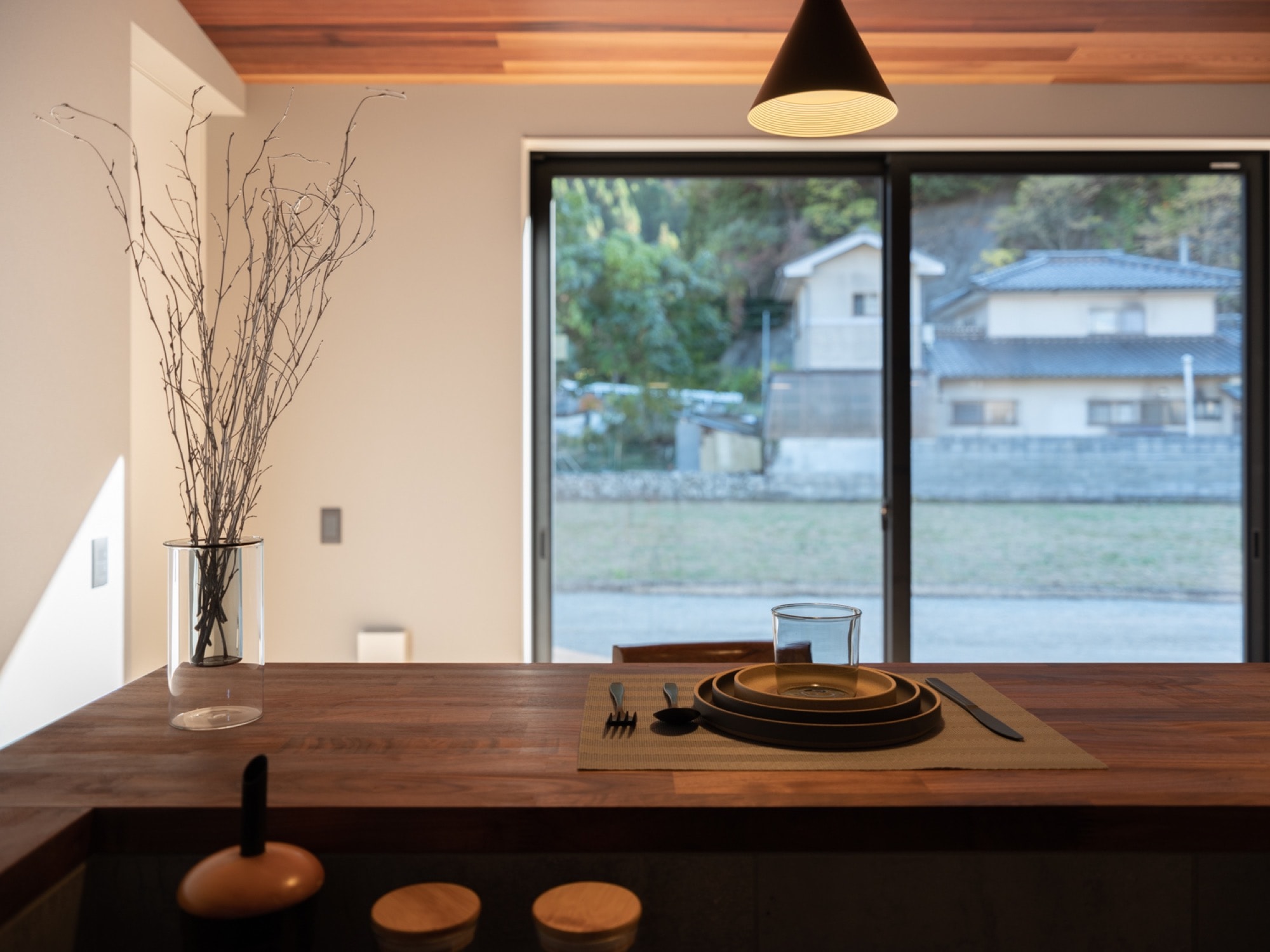 最近は高梁市のM様邸のように、ダイニングテーブルとカウンターを一体にした造作カウンターが人気です。空間にゆとりが生まれ、すっきりと洗練された印象がうまれます。