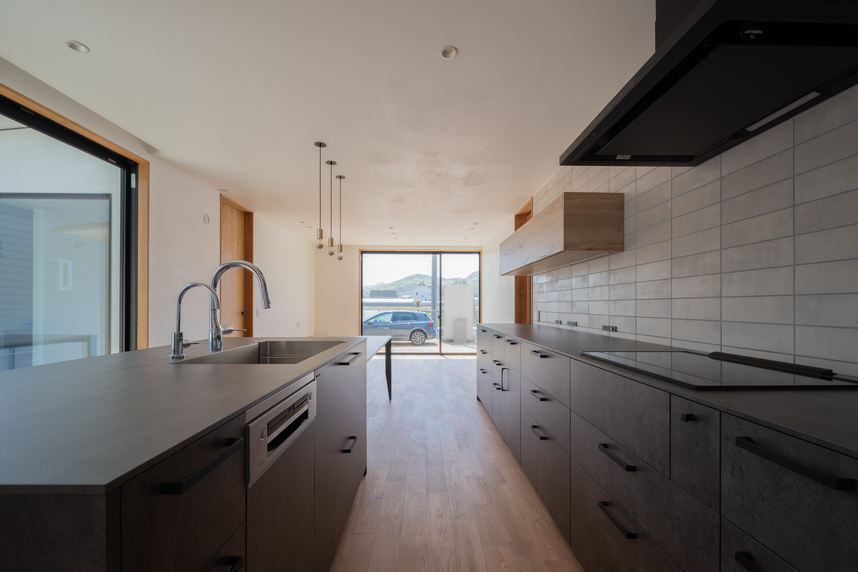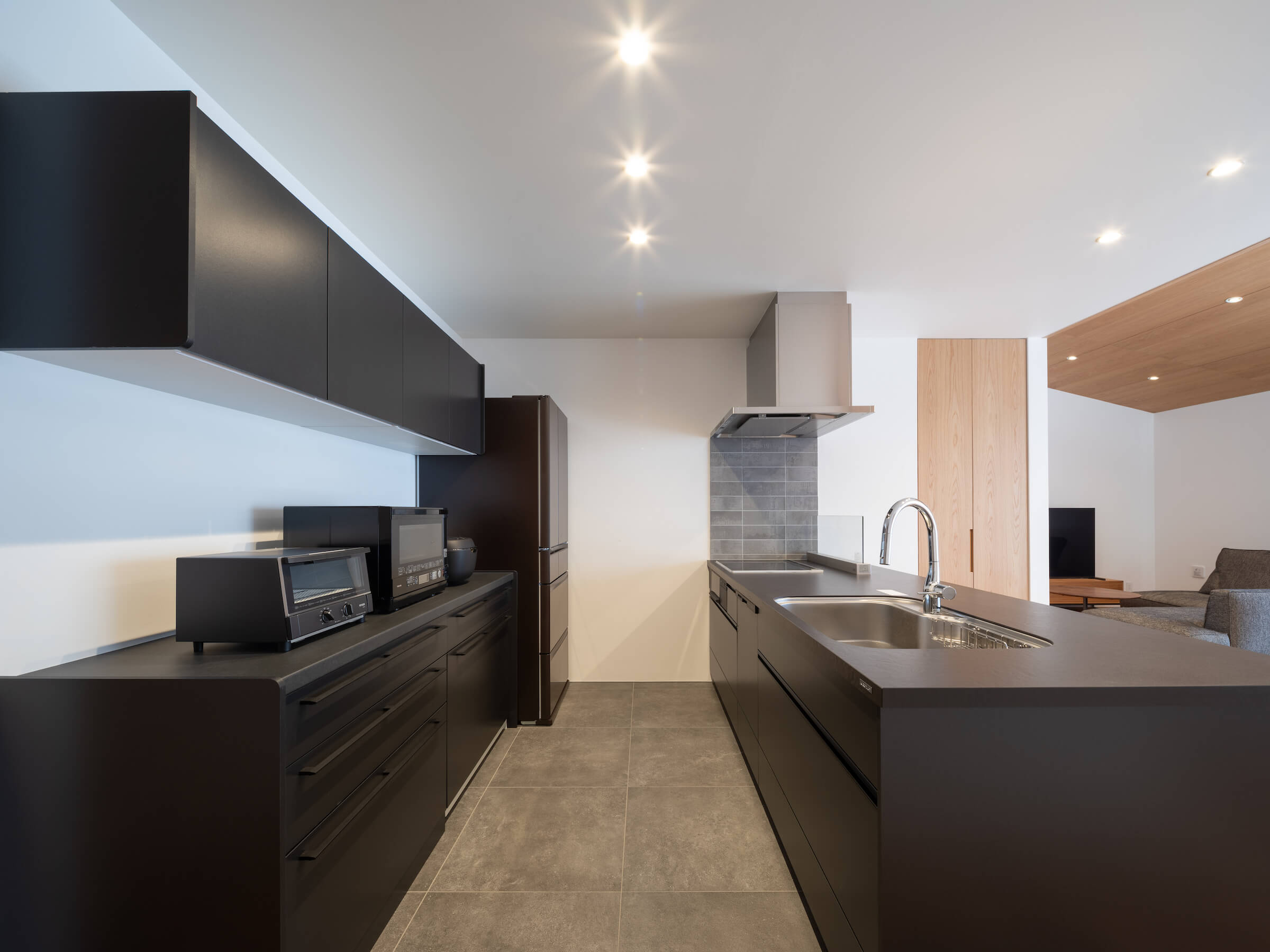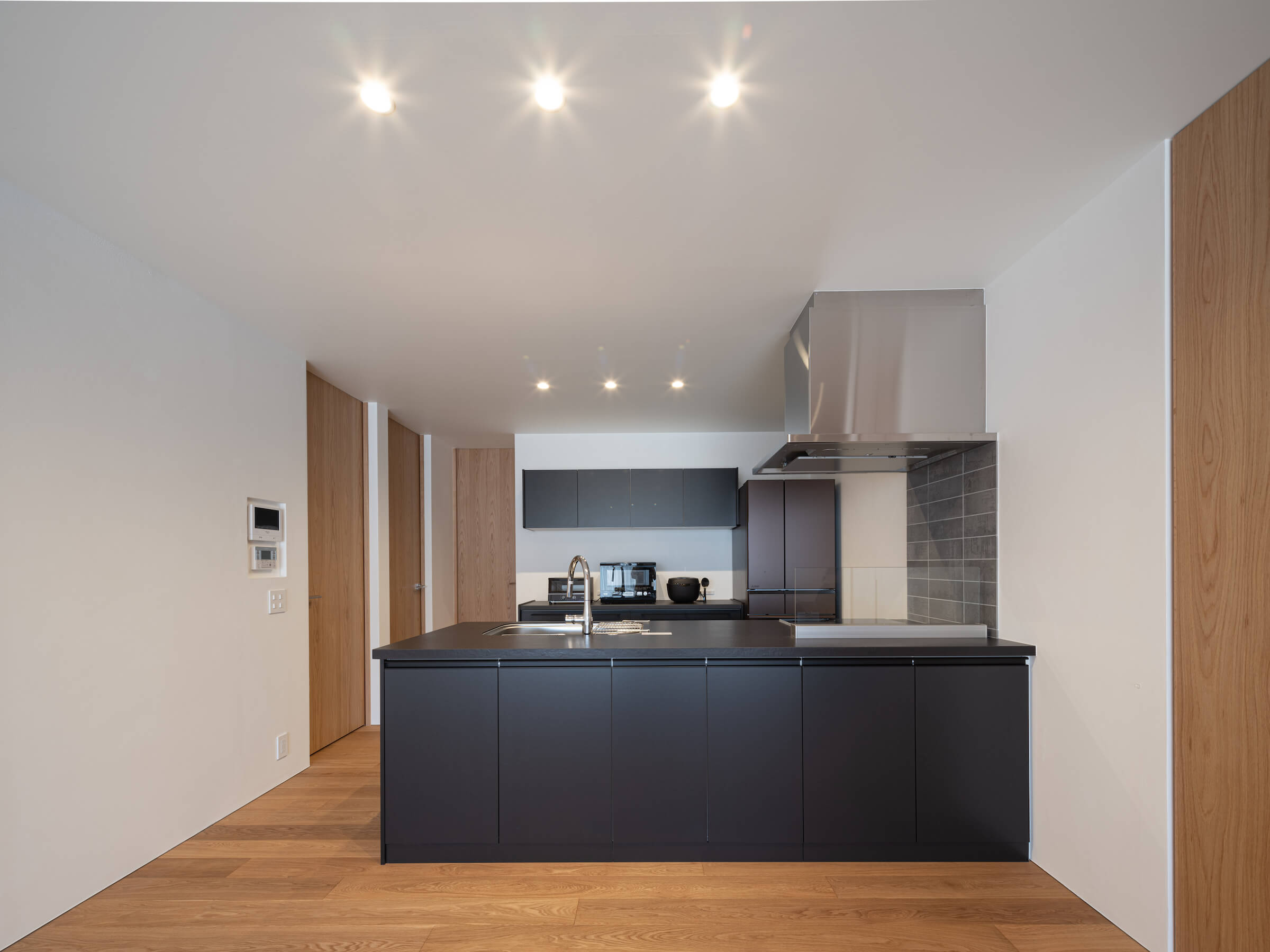 浅口市N様邸では、開放的なキッチンの壁に漆喰を取り入れました
