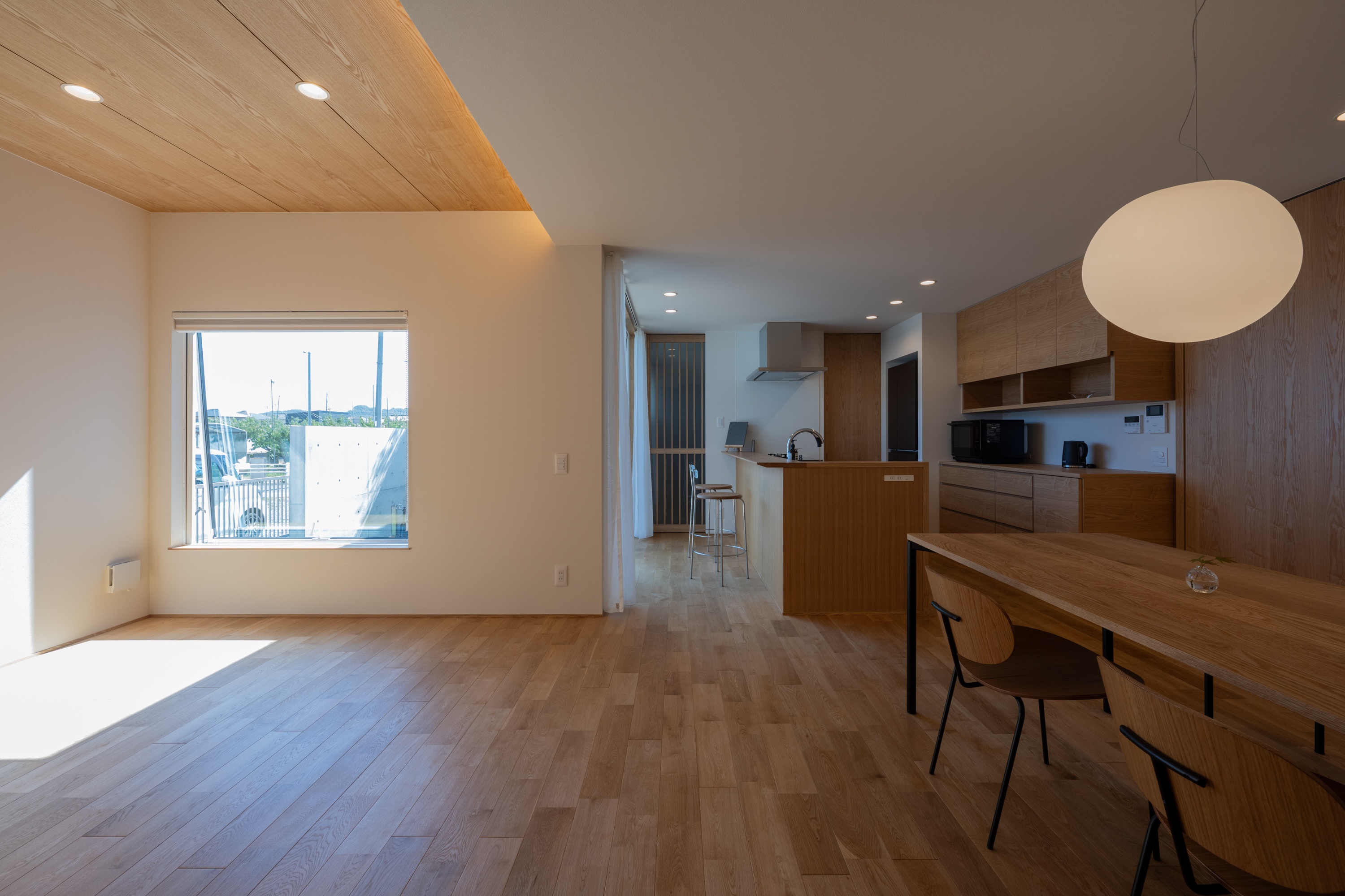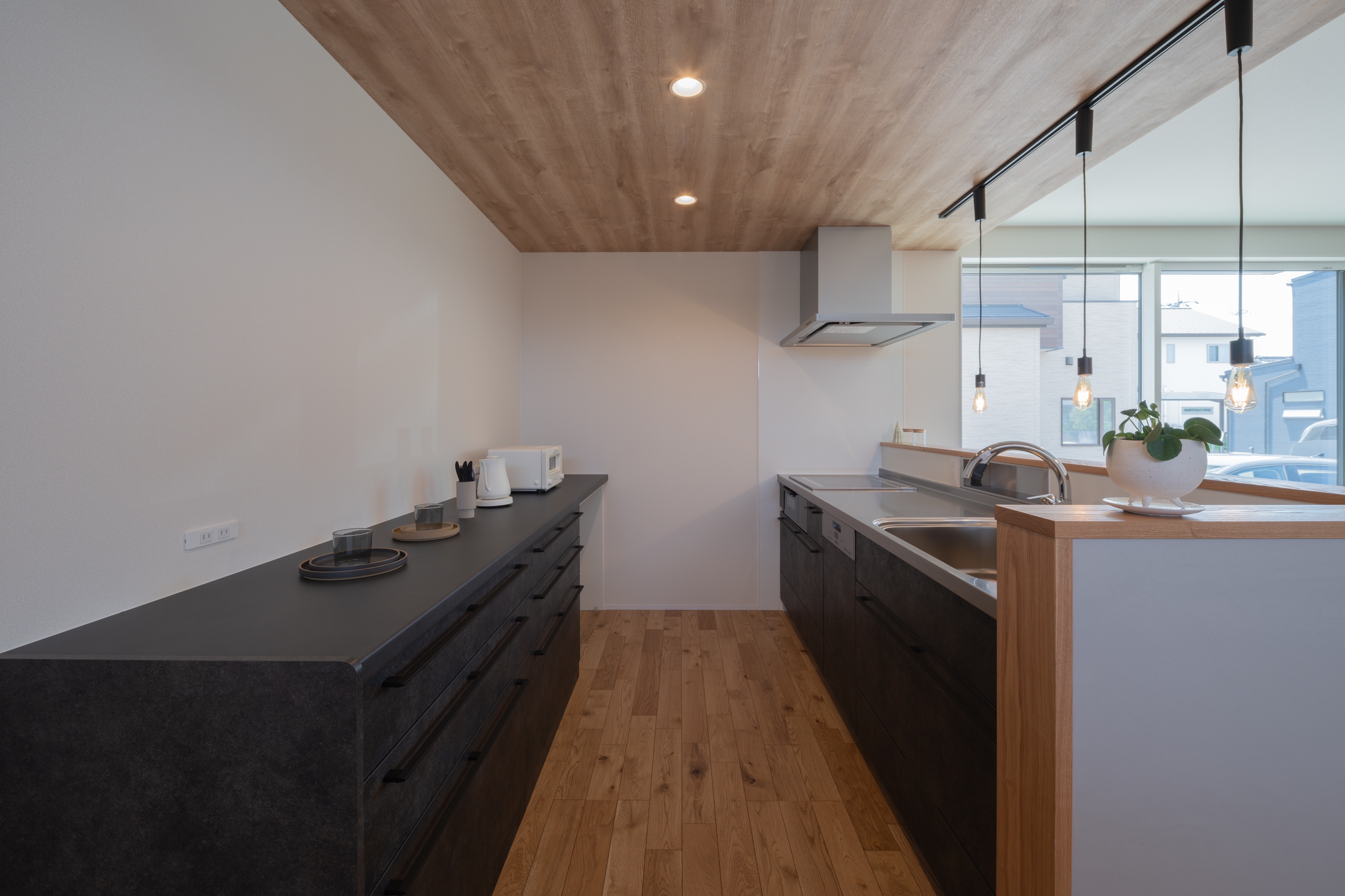 キッチンカウンターは中庭に面しており、大きな窓から明るい光が差し込むのも、魅力です。