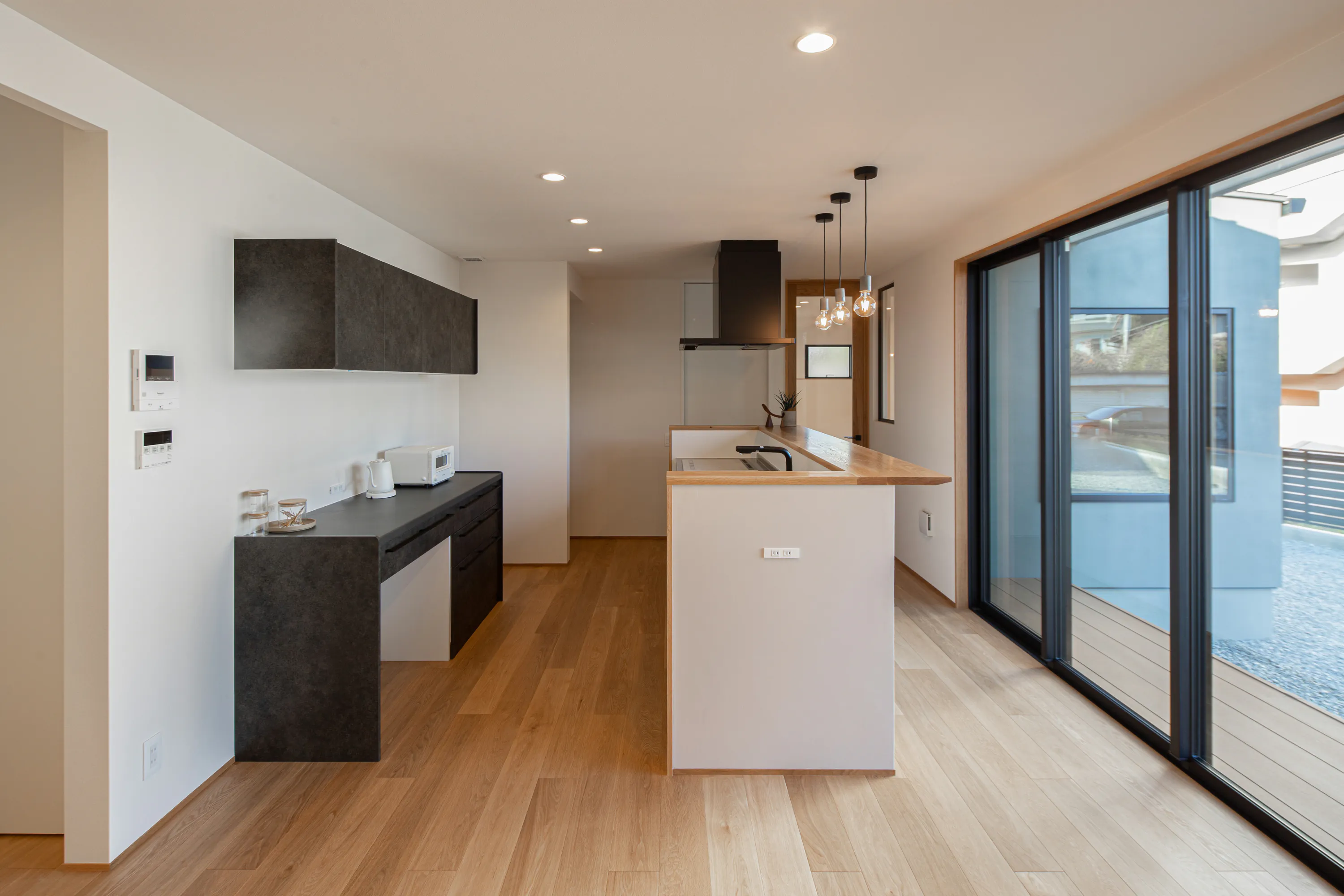 大きな窓と、複数の照明機器の設置で、明るく伸びやかな空間を実現した、岡山市H様邸のキッチン