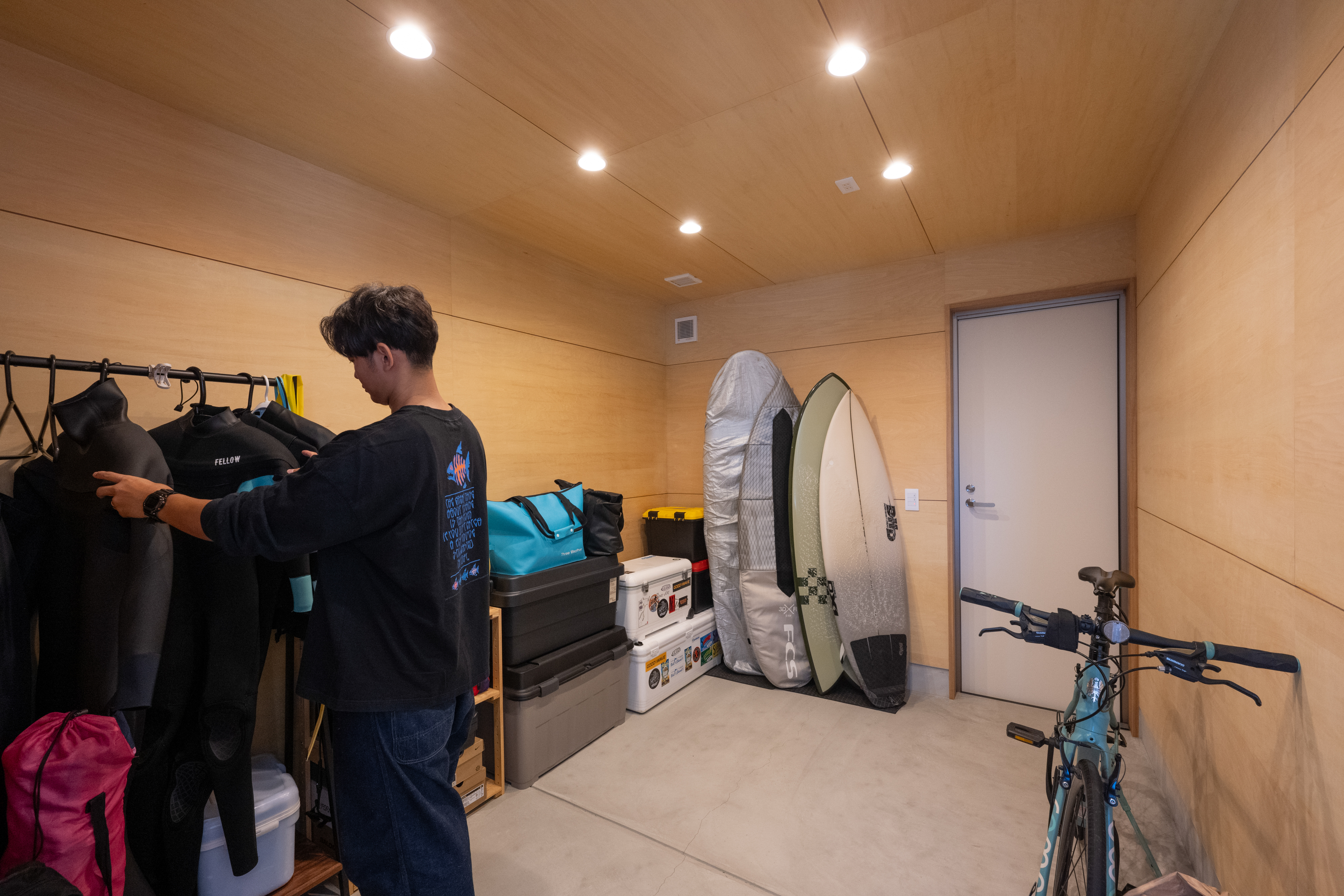 アウトドア用品を入れるので、床は掃除がしやすいように土間のままにしました。