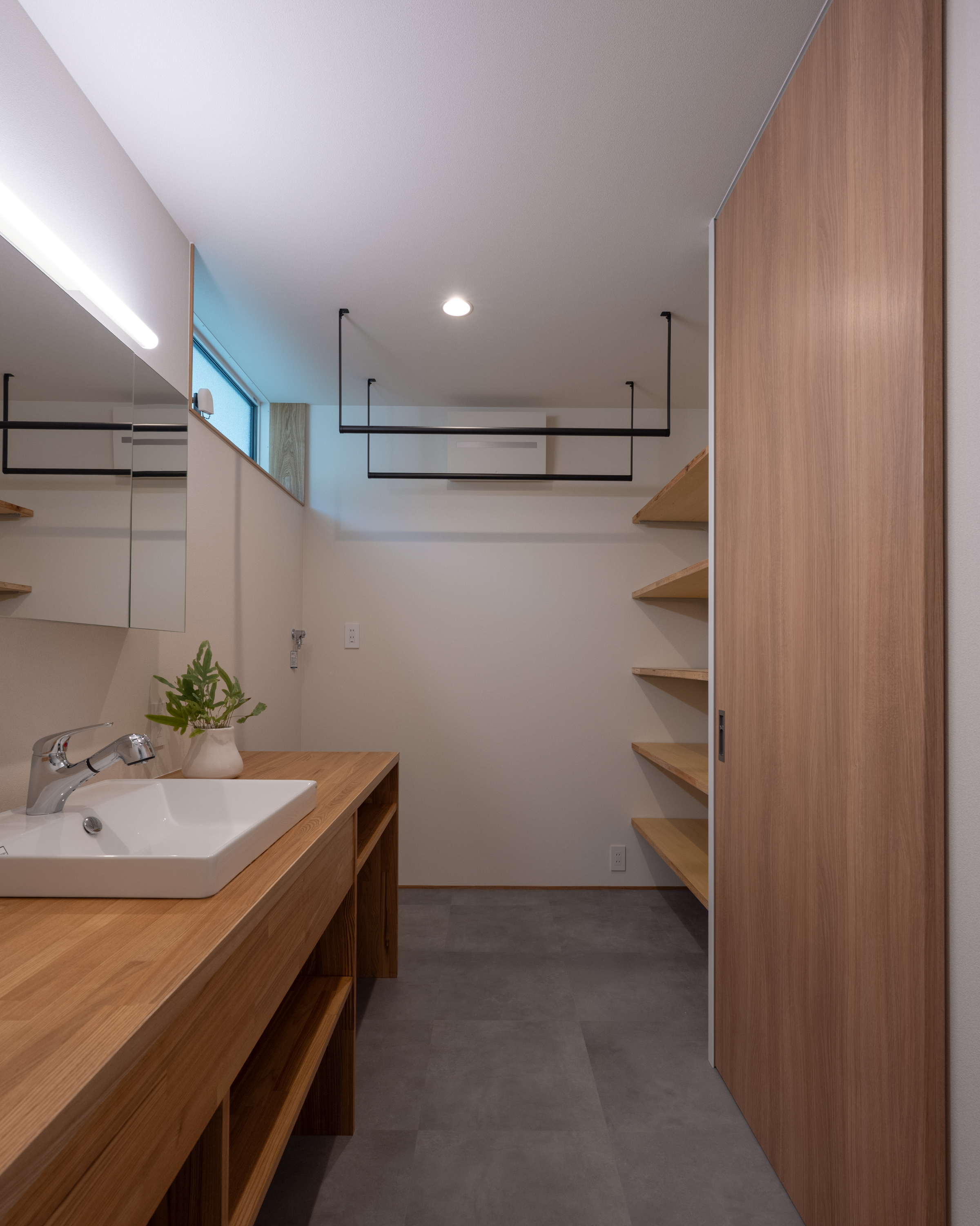 脱衣・洗面・ランドリーを兼ねた平屋のお家。洗濯機から干す動線、さらに干したものをファミリークロークへ収納する動線まで一直線。