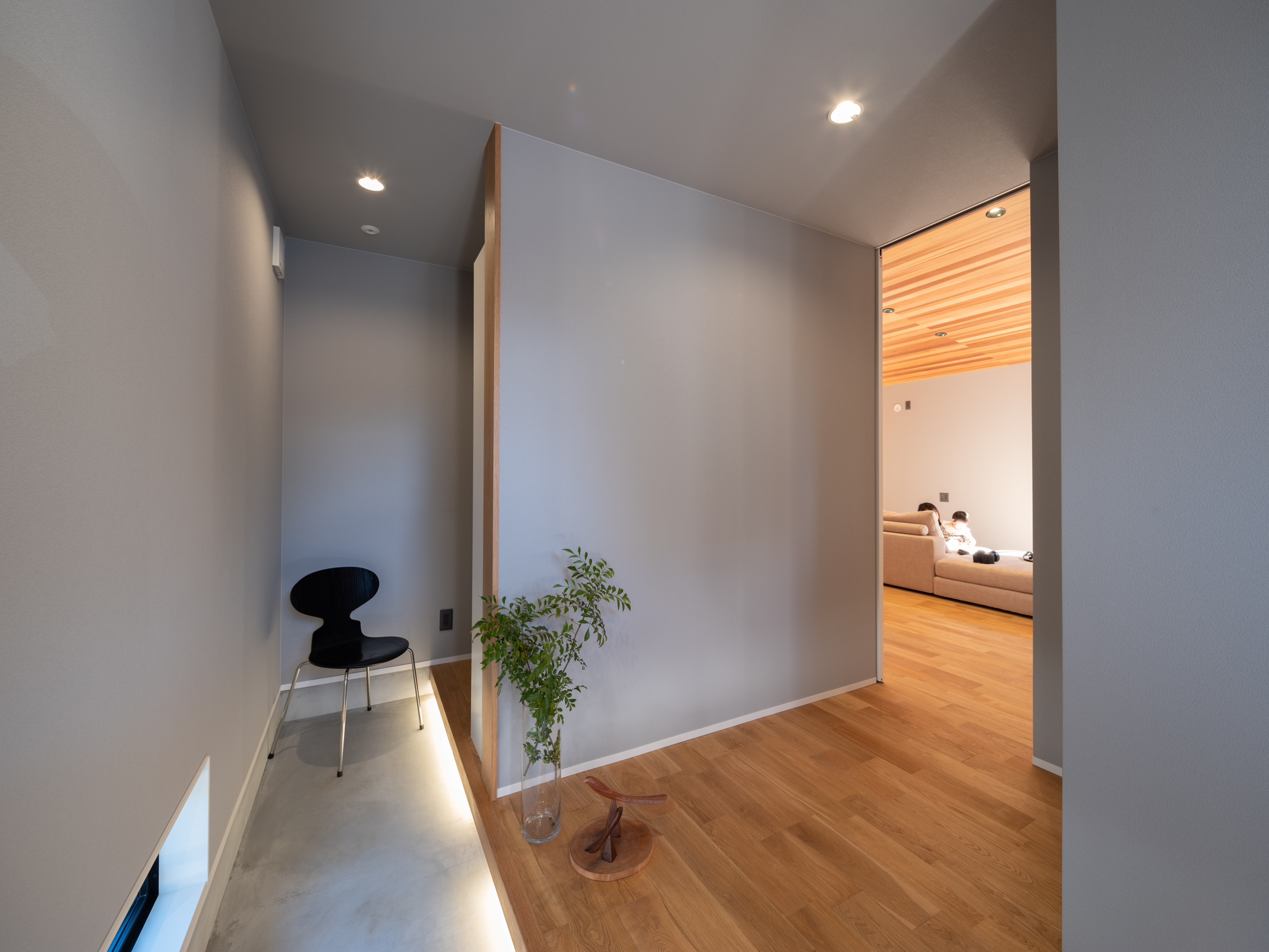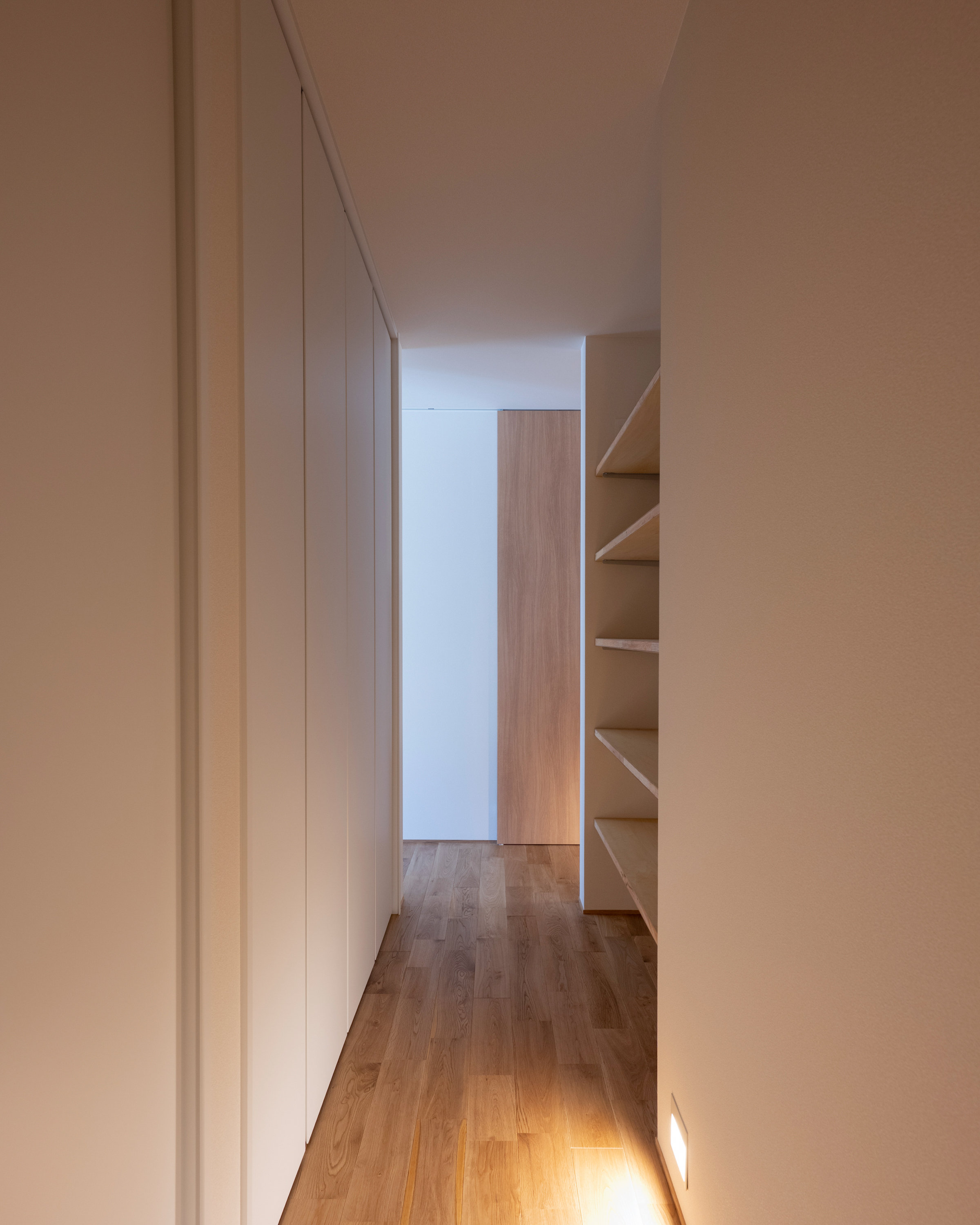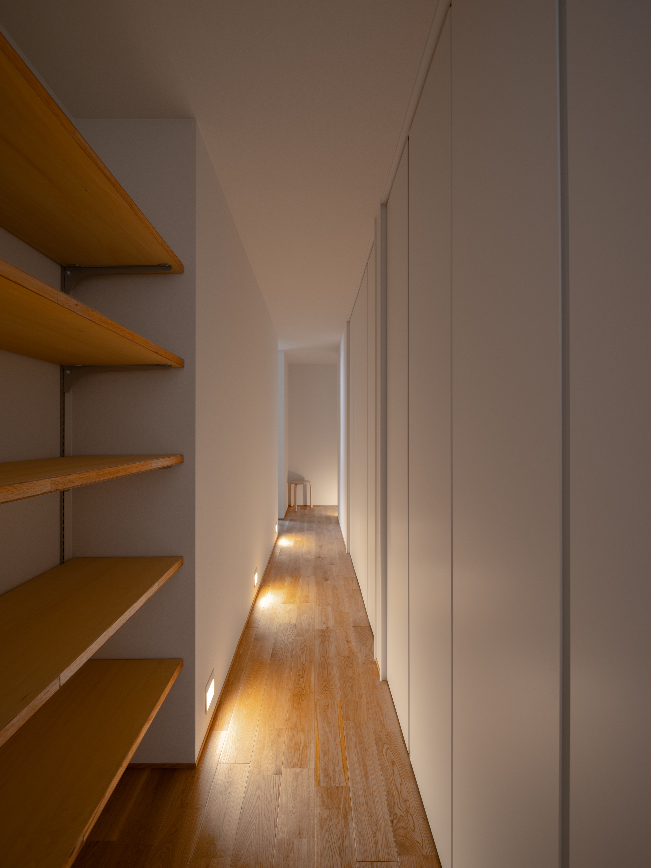 そして、もう一つのポイントが照明計画。収納が多い場所は生活感が出やすいのですが、この廊下は天井照明をあえて入れず、足元の照明でやさしく照らしています。