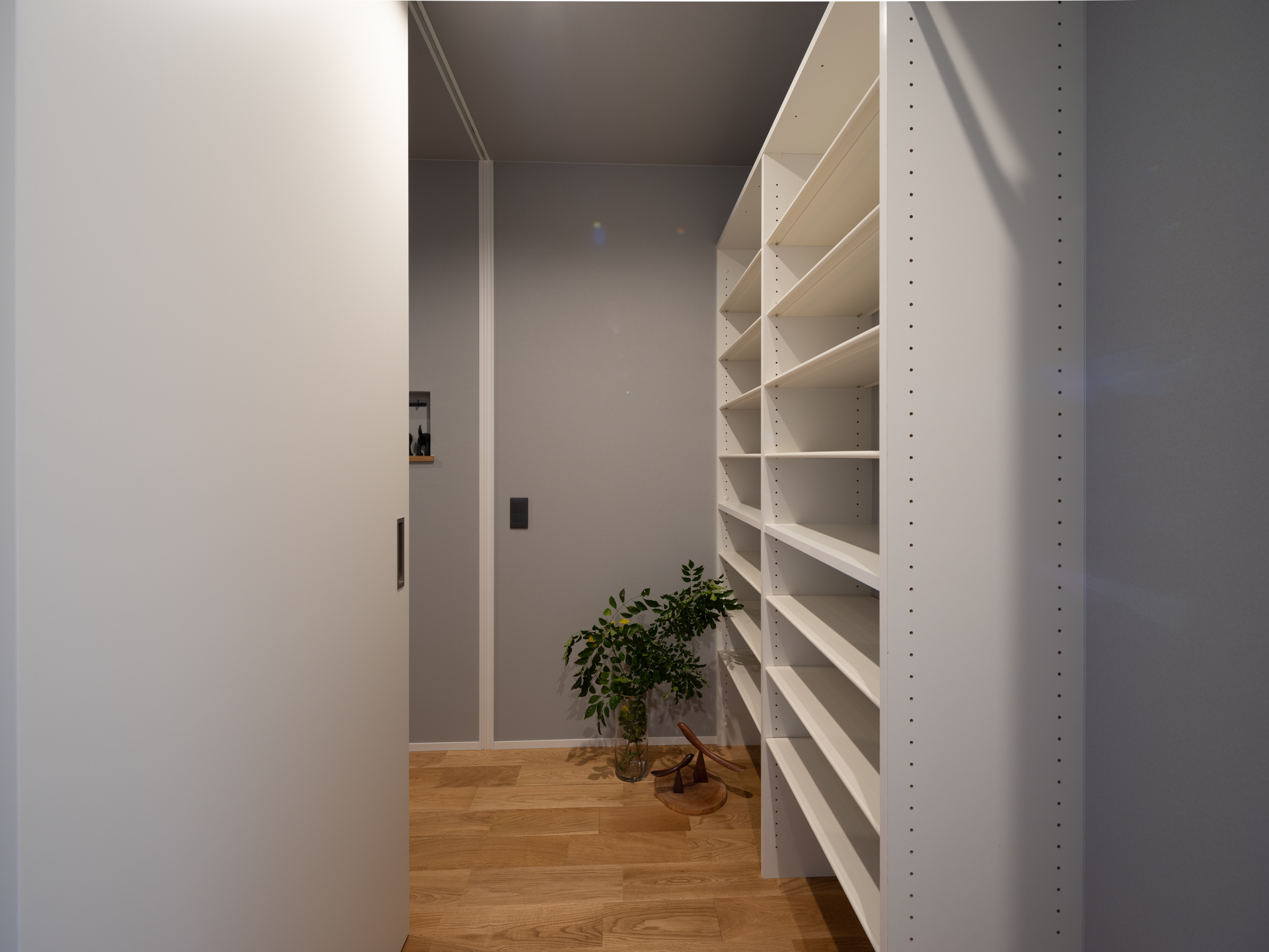 まずはキッチンの例。「パントリーが欲しい」という相談は多いのですが、部屋として作らなくても、キッチンのすぐ横に“置ける場所”をつくるだけで、実質パントリーとして十分機能することがあります。