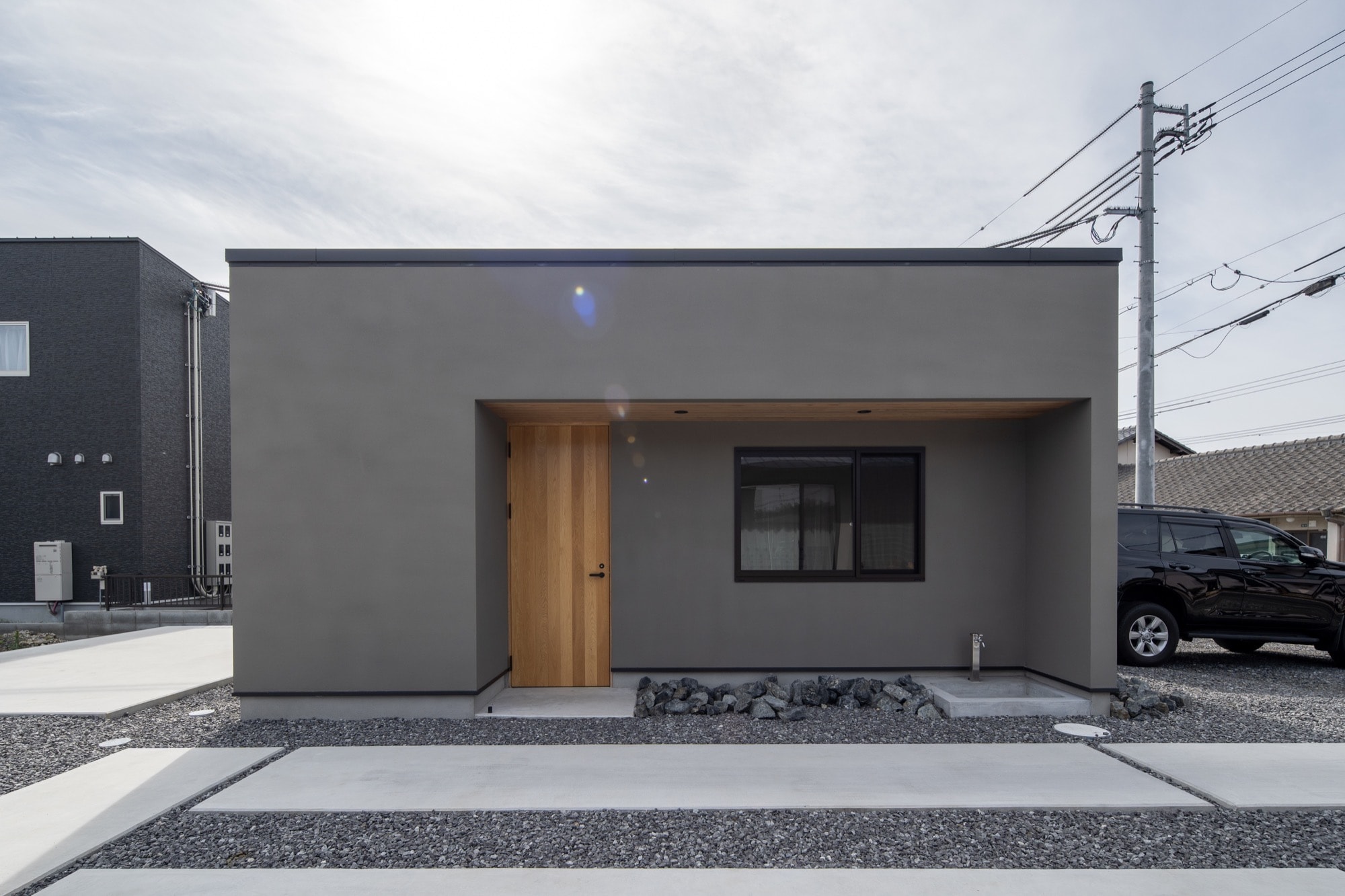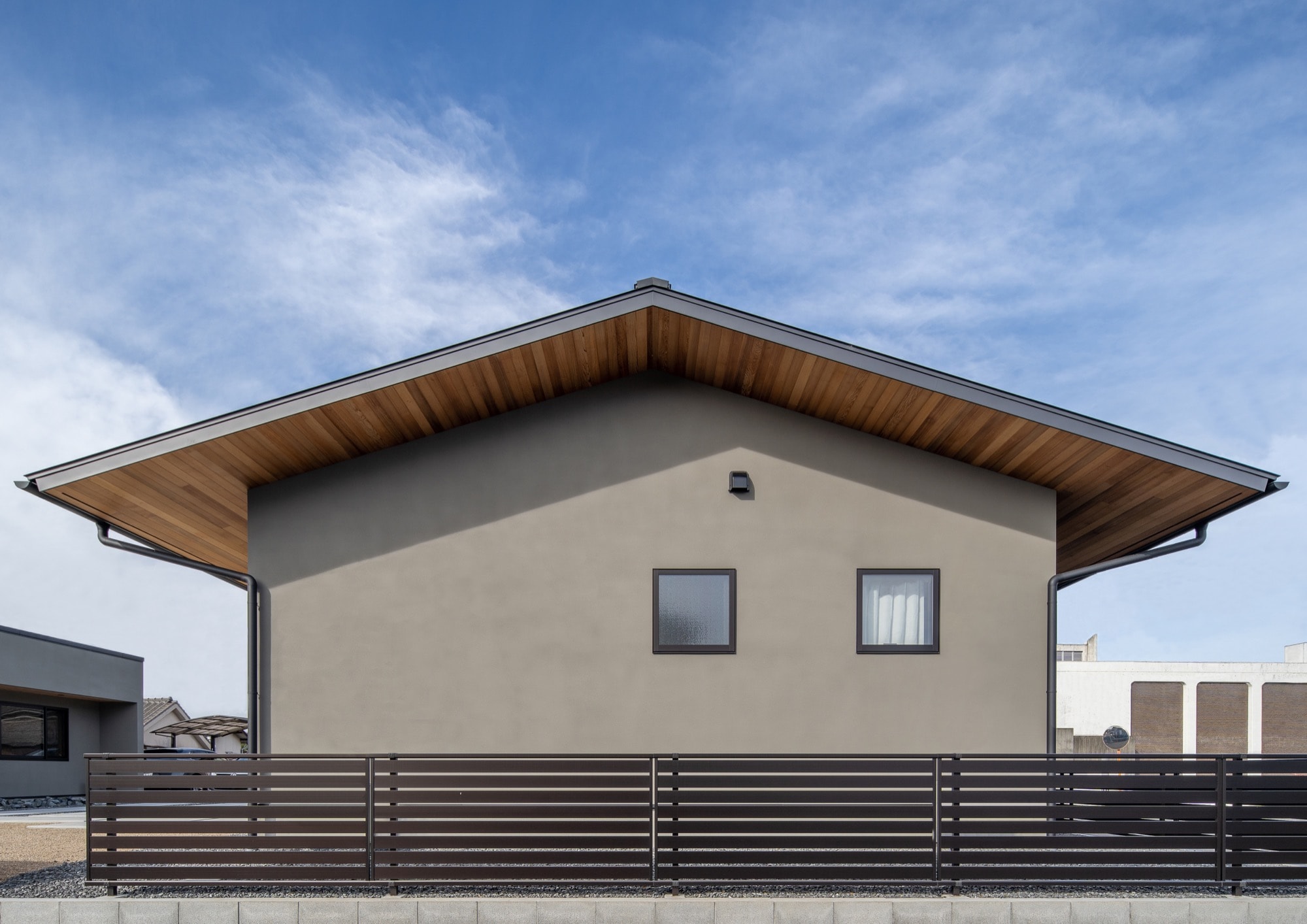 切妻屋根の庇を長く出すことで、外壁に直接雨がかかりにくい設計に。