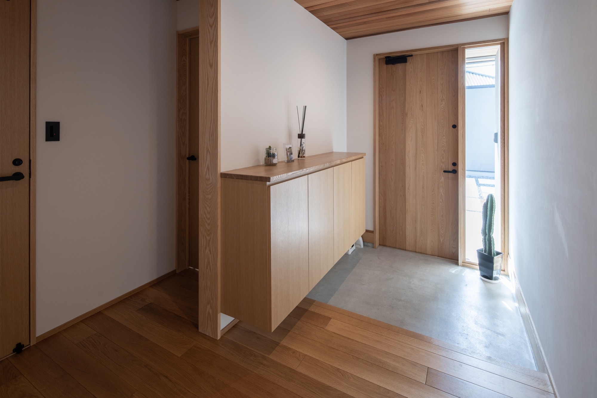 無垢材の床、造作の木製ドアを設けることで家全体が温かみのある雰囲気に。