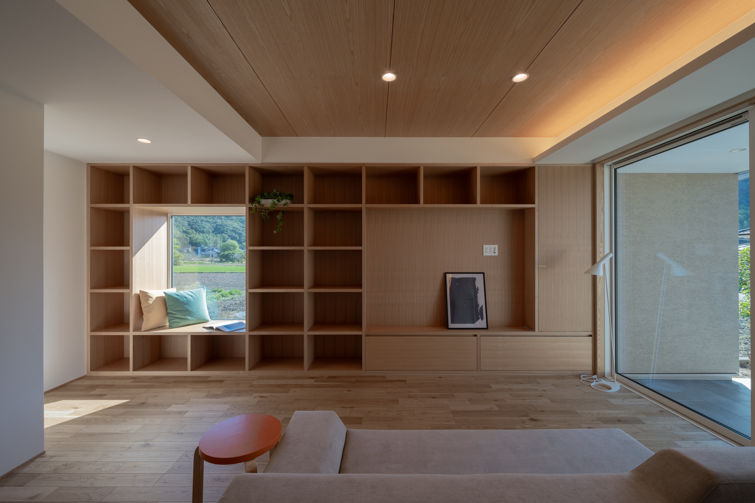 ・本棚の一角に座れるスペースを作り、大きなFIX窓から四季を感じることができる。