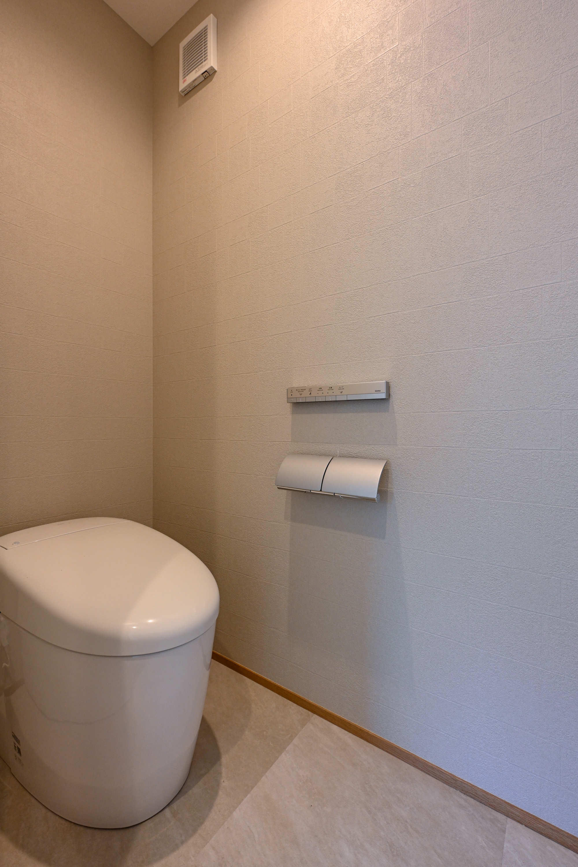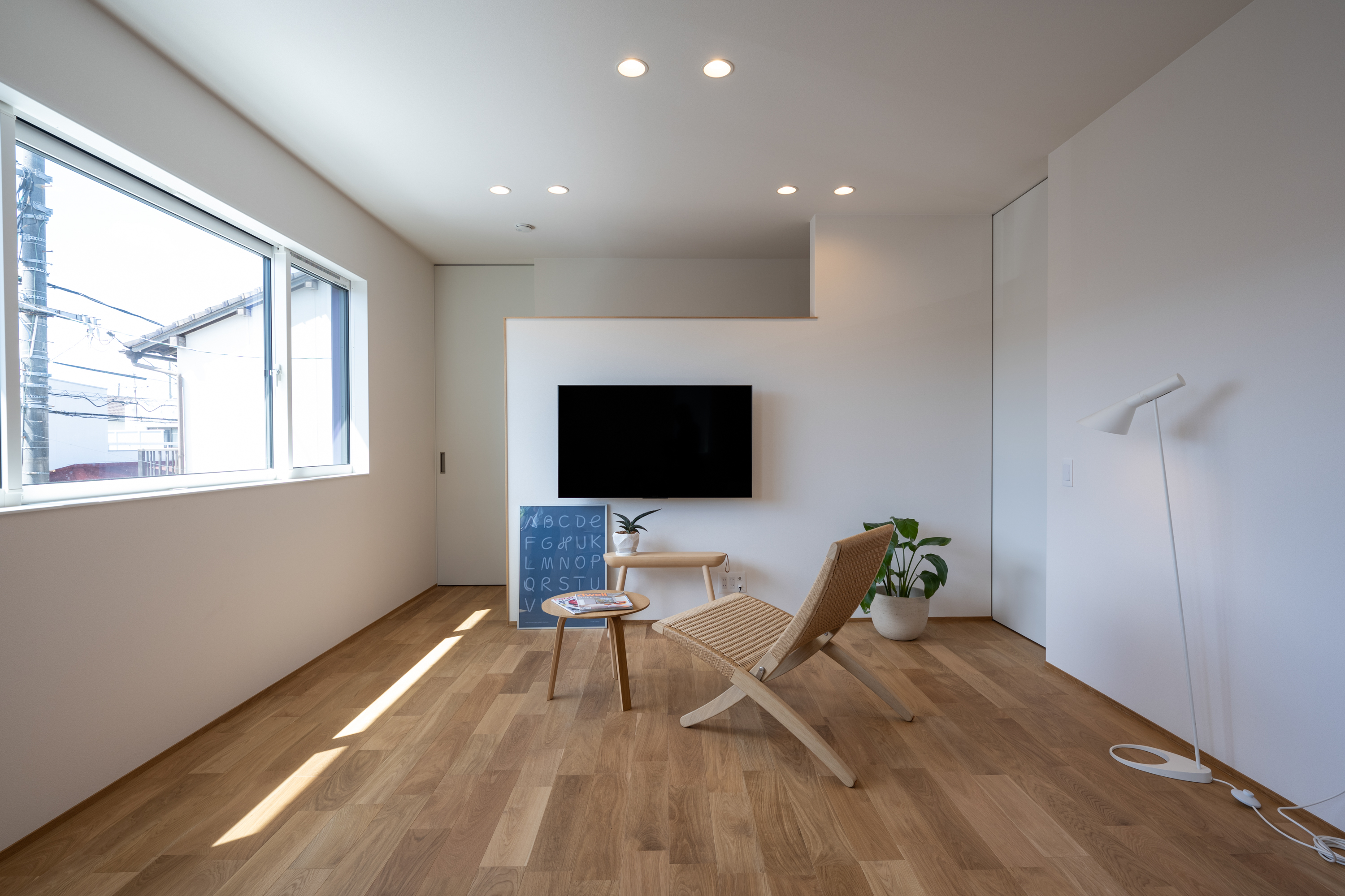 パントリーにはロールスクリーンをつけてもすっきりと魅せられる工夫として、垂れ壁を造っています。マグネット壁にプリントを貼ったり、WIFI機材を入れるスペースがあったりと生活感が出ますが、来客の際にはロールスクリーンですっきりと隠せます。