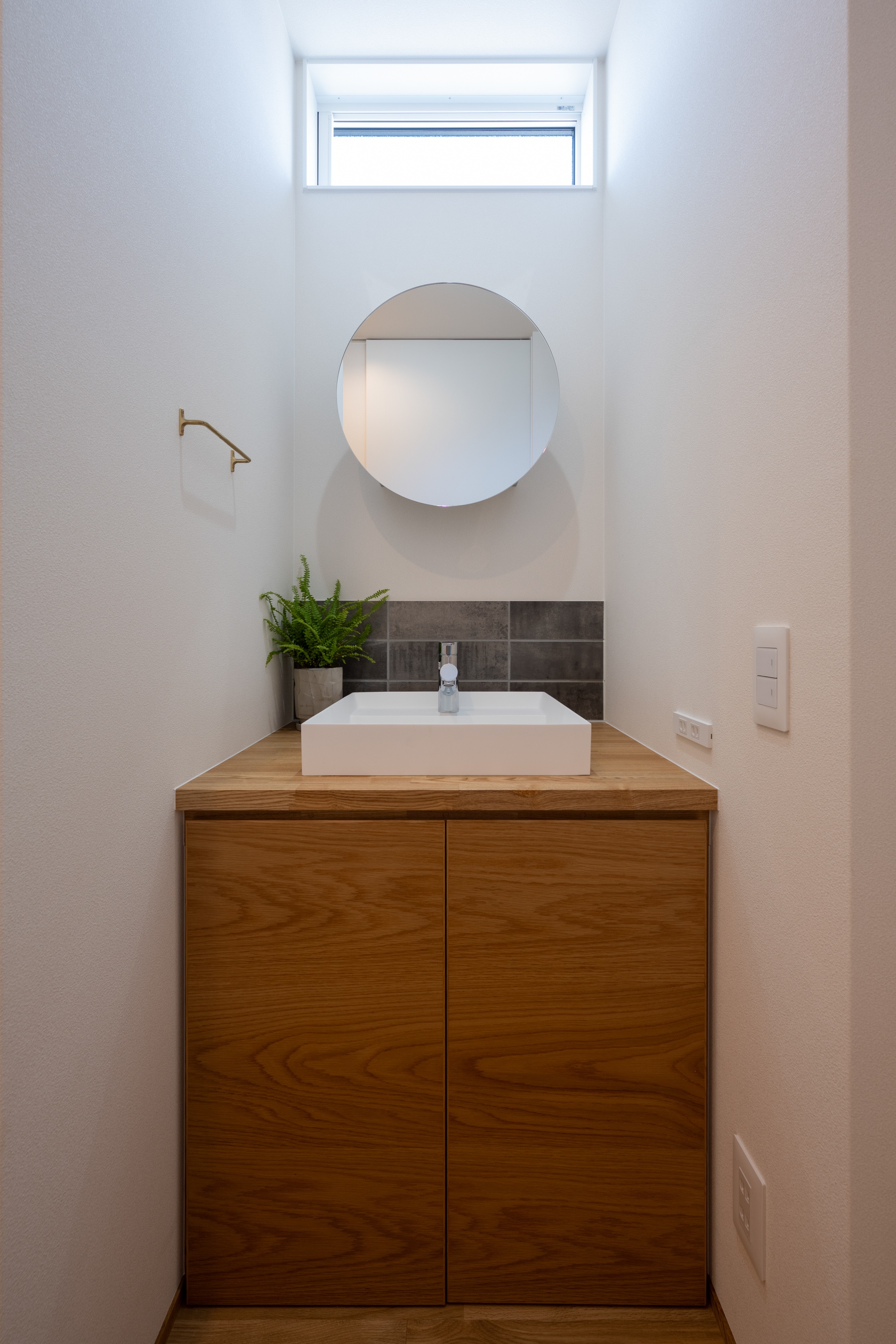 2階にも洗面台があり、丸い窓の中にも収納があるため物が外におきっぱなしになることがありません。タイルを1階洗面台と色違いにそろえることで雰囲気に統一感があります。