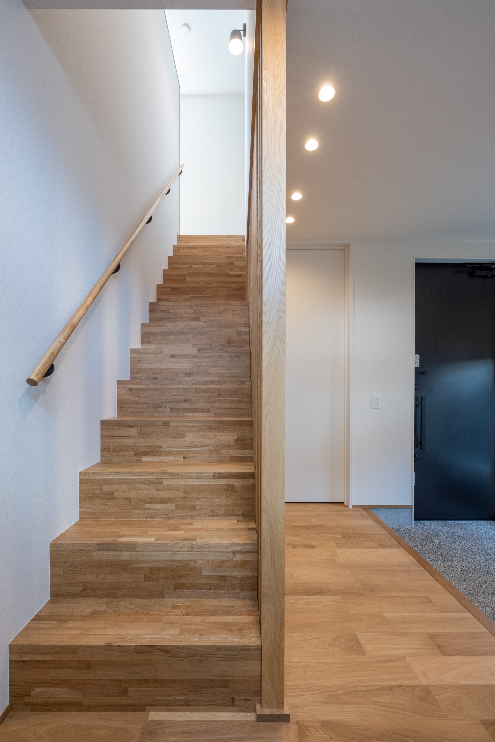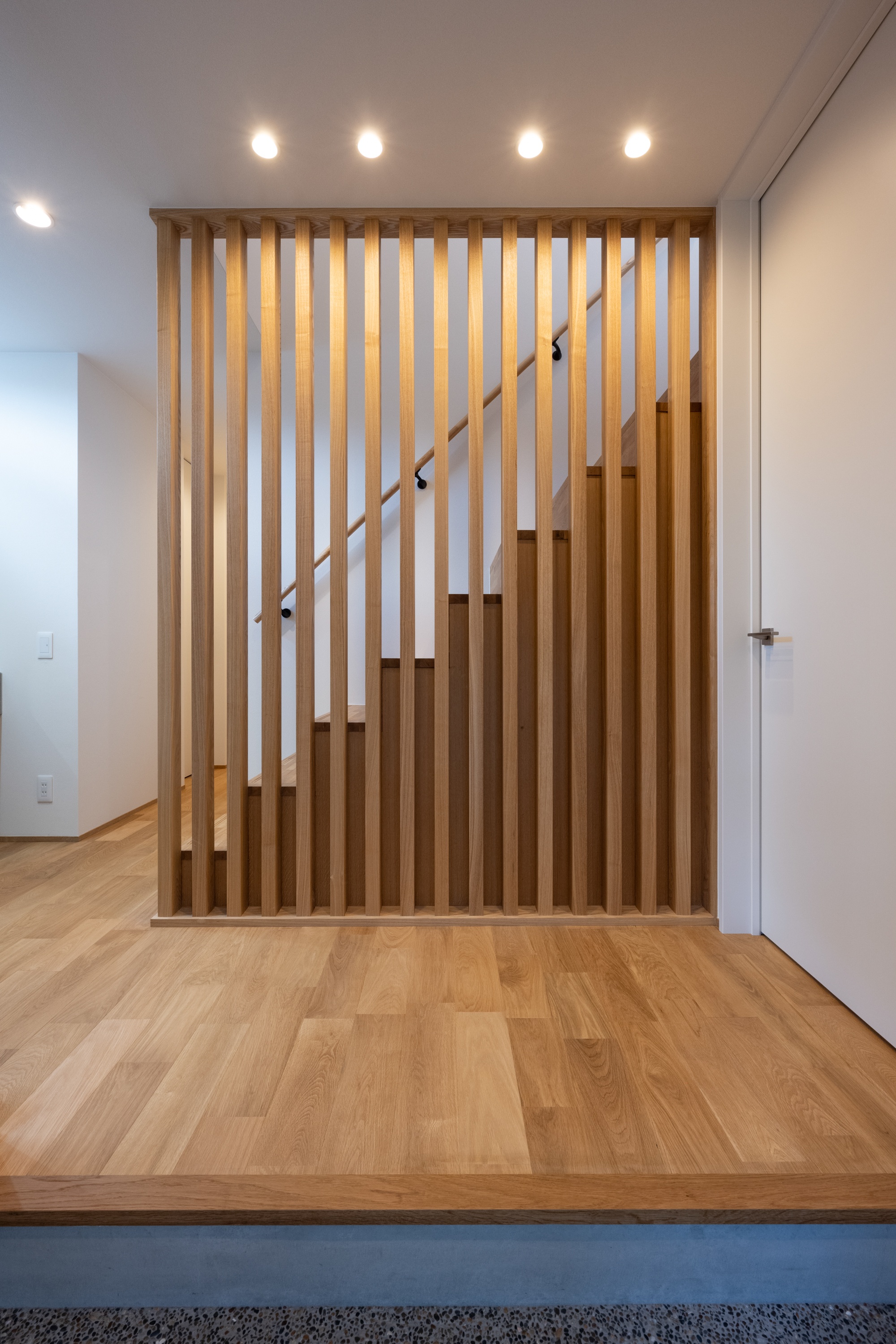 玄関を上がってすぐにインパクトのある格子。ダウンライトを格子に寄せて配置することで、ふんわりと照らしています。奥の階段は格子越しにすっきりとしたシルエットに見えるよう、踏み板と蹴込を突きつけにするこだわりぶりです。